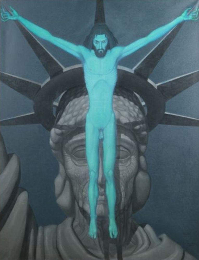 Sans doute, la colonne vertébrale du livre comme celle de l’auteur c’est la peinture, les tableaux, mis au service d’une pensée qui finalement est sortie du cadre des arts plastiques, pour se muer en mots. Mais, même avant d’arriver à sauter par-dessus la frontière entre les deux formes d’expression, la peinture a toujours été pour Cupsa (ou peut-être seulement pendant l’étape rassemblée entre les deux couvertures du livre) non pas un but en soi, mais un moyen pour modeler et rendre visible des idées. Car chaque toile de Cupsa prouve qu’il a « vu des idées » comme aurait dit Camil Petrescu et qu’en même temps, il essaye en employant d’une manière presque inappropriée les outils du peintre, de faire en sorte que d’autres aussi puissent les voir. Quoi d’autre qu’une telle tentative, d’autant plus risquée qu’elle est troublante, pourrait être ce tableau où l’homme est crucifié sur une statue de la Liberté vieillie ?